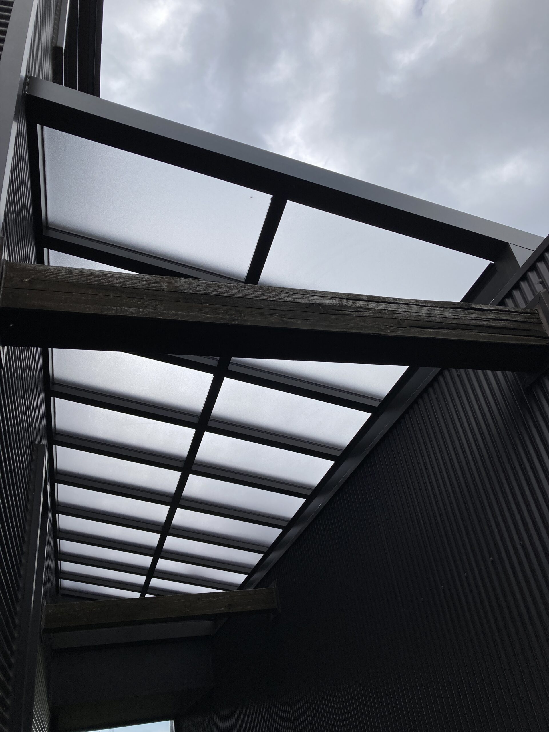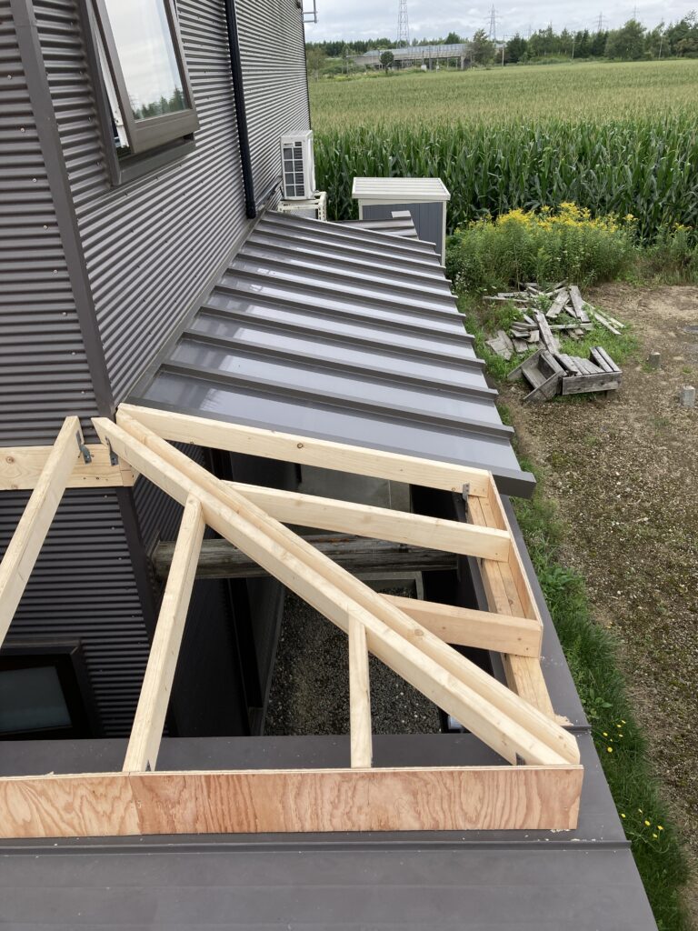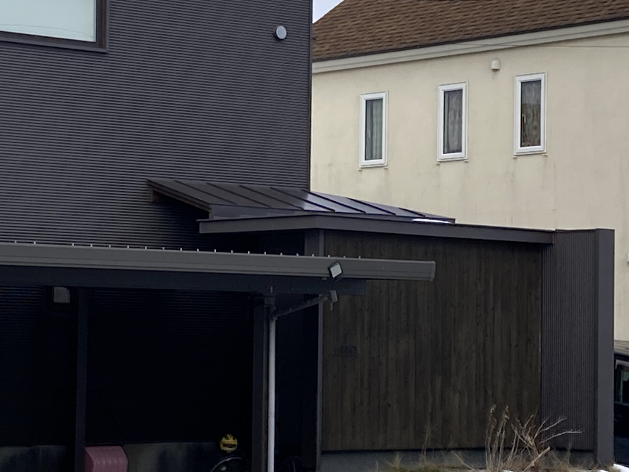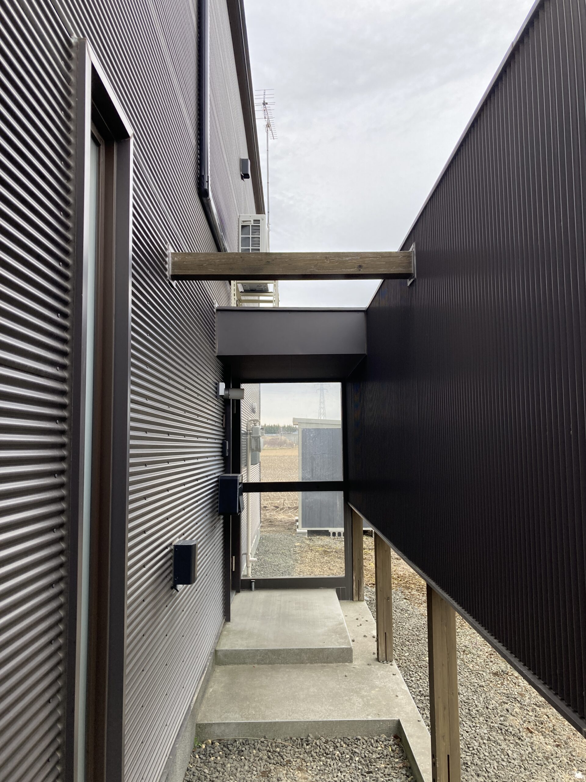 冬季間の降雪対策として、玄関のアプローチ部分にポリカーボネートと板金の組み合わせで屋根を設置しました。